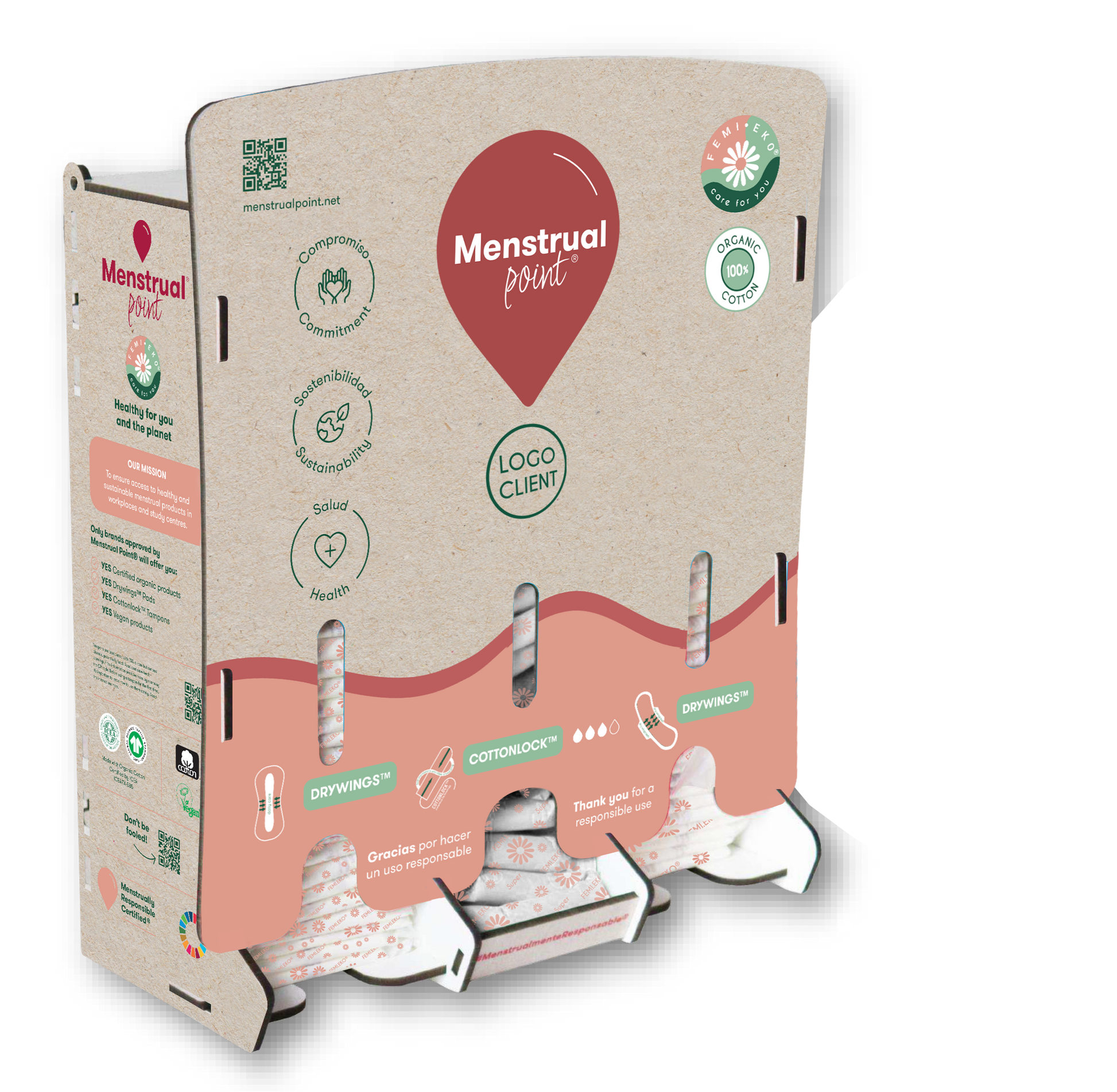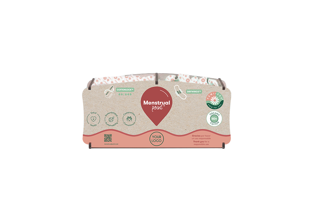 Dispenserul menstrual este alimentat cu tampoane și absorbante de unică folosință Femi.Eko®, cu tehnologii patentate, mai sigure medical, și sunt realizate din 100% bumbac organic certificat GOTS.