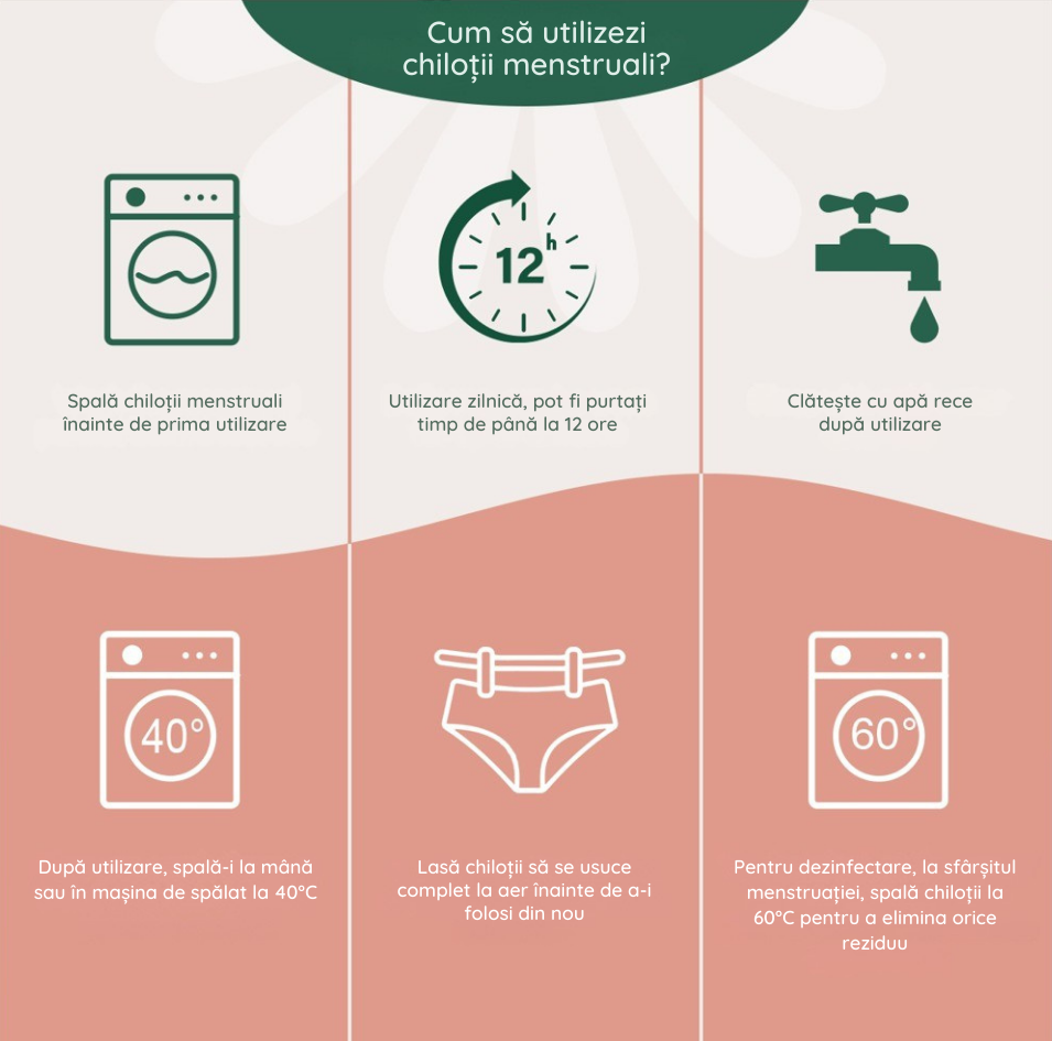 Respectând aceste instrucțiuni, vei putea folosi chiloții menstruali Femi.Eko® în mod eficient și sănătos, fie că este vorba despre menstruație, incontinență ușoară sau scurgeri vaginale. Bucură-te de durabilitatea chiloților timp de peste 2 ani și de confortul și siguranța lor zilnică 🌸